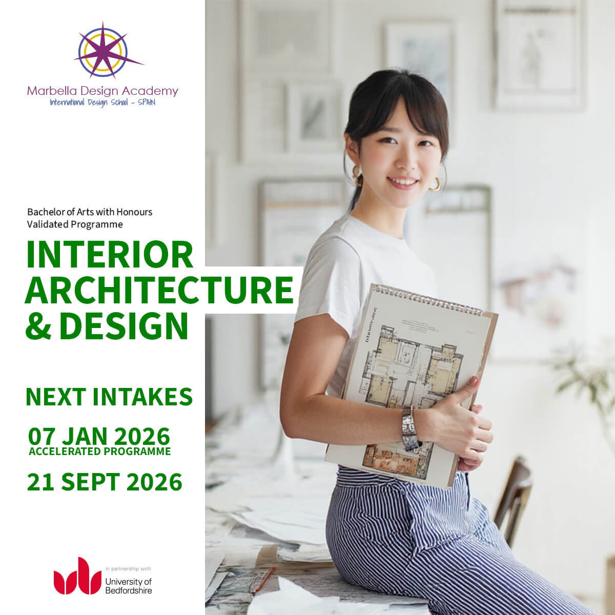 Join Marbella Design Academy in sunny Spain for a BA (Hons) degree in Interior Architecture & Design. Experience top-tier education at one of the world's most exclusive design schools. September intake now open—reserve your place today!