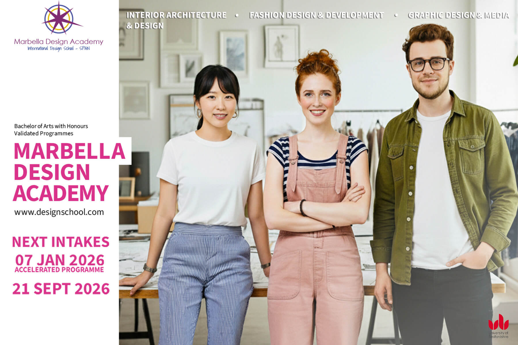 Join Marbella Design Academy in sunny Spain for a BA (Hons) degree in Interior Architecture & Design, Graphic Design & Media, or Fashion Design & Development. Experience top-tier education at one of the world's most exclusive design schools. September intake now open—reserve your place today!